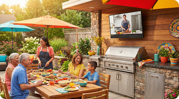 Never miss a play while you grill. Our outdoor TVs are designed to cut through glare and withstand heat, smoke, and grease.